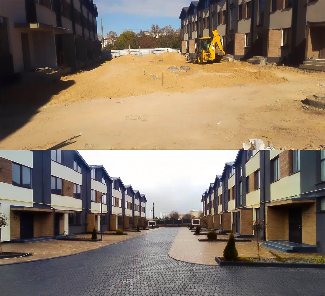 Реалізація благоустрою, мощення, будівництво доріг; заливка бетонних покриттів паркінгів із топінгом; виготовлення і монтаж оствітлення та МАФів (дитячі майданчики, лави, перголи, басейни, фонтани і тп)